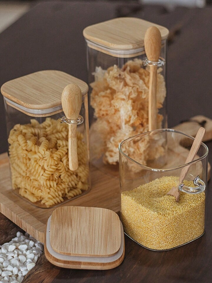 Kit de Potes Herméticos de Vidro Quadrado com Tampa e Colher de Bambu